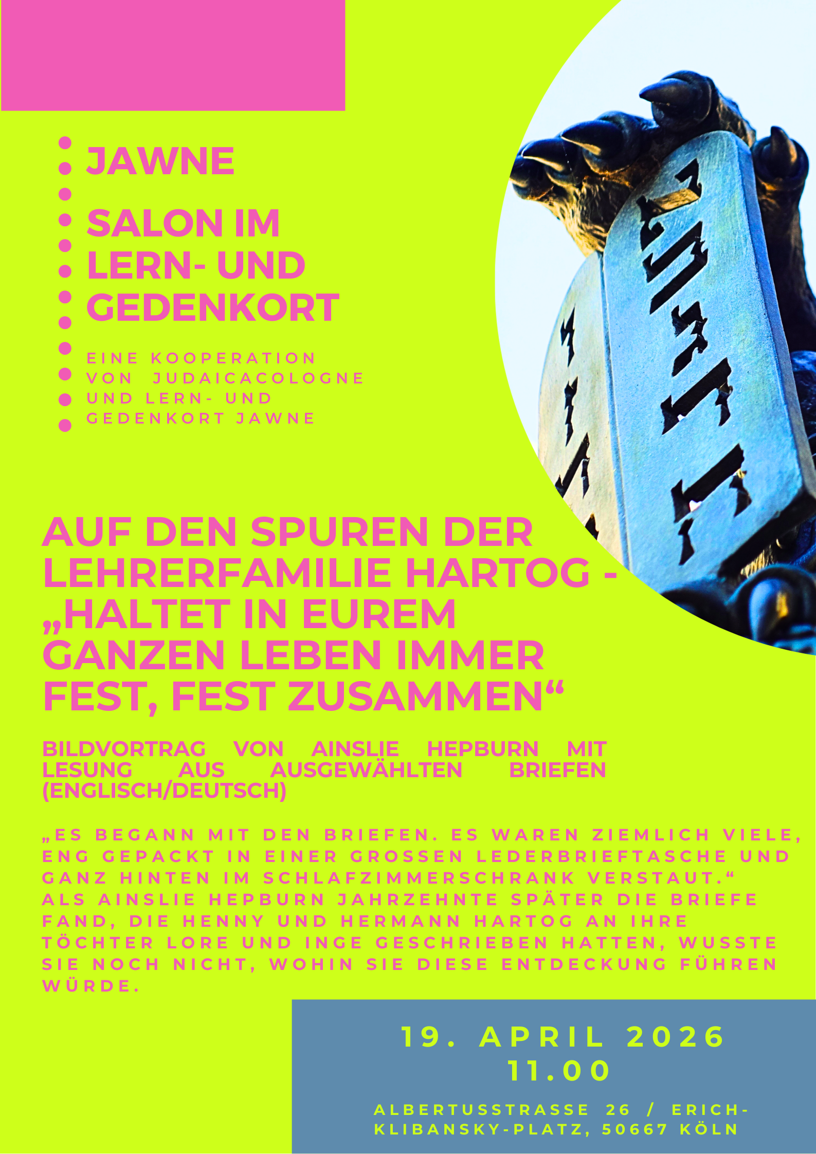 Lern- und Gedenkort Jawne Erich-Klibansky-Platz, KölnBildvortrag von Ainslie Hepburn mit Lesung aus ausgewählten Briefen (englisch/deutsch) „Es begann mit den Briefen. Es waren ziemlich viele, eng gepackt in einer großen Lederbrieftasche und ganz hinten im Schlafzimmerschrank verstaut.“ Als Ainslie Hepburn die Briefe fand, die Henny und Hermann Hartog an die Töchter Lore und Inge geschrieben hatten, wusste sie noch nicht, wohin...